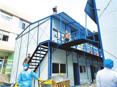 180小時日夜兼程,300余人次“逆風(fēng)”前行……在與疫情的角力中,建設(shè)者們跑出令人驚嘆的“珠海速度”。1月26日10時,完成團(tuán)隊組建;1月28日14時,第一棟隔離病房板房搭建完成;1月29日16時,第二棟隔離病房板房落成;2月2日21時,隔離病房驗收移交院方……一個個時間節(jié)點,奏響了防疫阻擊戰(zhàn)鮮明的鼓點。