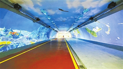 慢行隧道北接檸溪片區(qū)、南接拱北片區(qū),全長約1235米,內(nèi)部路面設置有人行道和非機動車道,其中人行道寬3.5米,非機動車道寬4.5米,隧道內(nèi)凈空高4米,人行道采用花崗巖石材鋪設,非機動車道采用紅色瀝青混凝土鋪設,拱墻側(cè)面采用真石漆噴涂,可為市民提供安全、舒適、美觀的通行體驗。在滿足慢行交通基本功能的條件下,慢行隧道按照“安全、舒適、美觀、經(jīng)濟、有特色”的原則進行藝術創(chuàng)作,隧道中不僅設置有視頻動畫投影段用于展現(xiàn)珠海城市文化與特色,頂面還繪制了3D藍天白云彩繪,同時為緩解視覺疲勞、增加景觀趣味性,每隔50米左右,還加入了一些飛鳥、熱氣球、航天器等元素的圖案,帶給市民高品質(zhì)的慢行交通體驗。