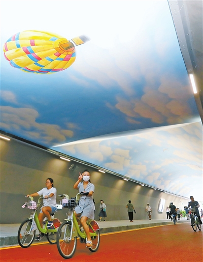 “朋友們,有沒有見過海底的魚?。縼戆逭辽铰兴淼览锞湍芸吹搅?!”——在慢行景觀隧道里,大學(xué)生小李對著巨形投影拍照發(fā)了個朋友圈