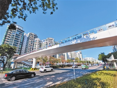 人民路貫穿香洲城區(qū)東西,是城市最重要的主干道之一。沿線住宅區(qū)、商業(yè)設(shè)施、學(xué)校眾多。未來,隨著香海大橋及其支線工程的全線通車,人民路的交通壓力將有增無減。人民路快速化提升工程(人行天橋部分)正是在這一背景下開展建設(shè)。項(xiàng)目建設(shè)的三座天橋選址行人過街需求最大的三個(gè)節(jié)點(diǎn)——安居園公交站、紅山公交站、工商大廈旁。昨日開放通行的安居園公交站天橋長60.45米,橋面鋪裝采用拉絲防滑花崗巖面磚,防滑性能佳。記者現(xiàn)場看到,配置的升降電梯符合無障礙出行需求。天橋兩側(cè)鮮花點(diǎn)綴,視野通透。